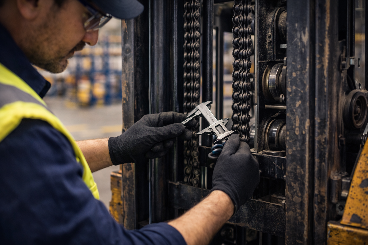 Because forklifts rely on multiple chains working together, even minor wear can cause uneven lifting or mast misalignment.